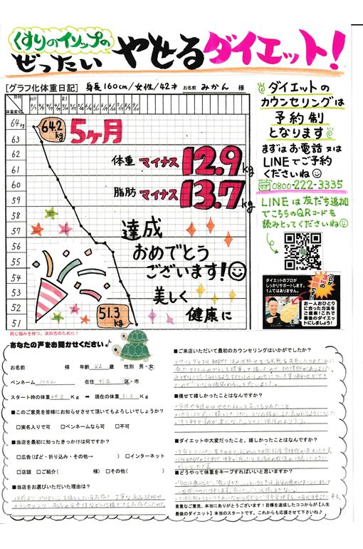 5ヶ月で体重12.9kg、脂肪13.7kgの減量に成功!(^^)!