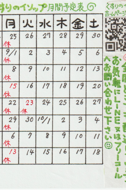 2025年8月営業カレンダー | ダイエットがうまくいかない方を東京にある街のくすり屋さんは応援いたします